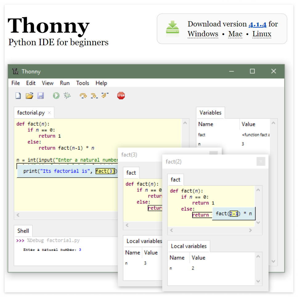 Thonny 4 is dedicated to Ukraine fighting the Russian invasion. 🇺🇦 Please support Ukraine! 🇺🇦 Download version 4.1.4 for • • Thonny Python IDE for beginners Features Easy to get started. Thonny comes with Python 3.10 built in, so ju